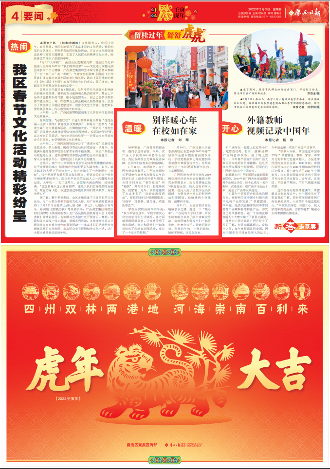 1月31日,農(nóng)歷除夕。在廣西大學(xué)萃苑餐廳,廣西大學(xué)副校長(zhǎng)羅廷榮代表學(xué)校向留校過(guò)年的同學(xué)們送上新春的問(wèn)候與祝福,為同學(xué)們分發(fā)“春節(jié)紅包”和“福袋”,并與同學(xué)們一起吃年夜飯,拉家常。此外,該校還組織了豐富多彩的“迎新春游園活動(dòng)”,留校同學(xué)們合唱愛(ài)國(guó)歌曲、寫福字、對(duì)春聯(lián)、猜燈謎,歡度新春佳節(jié)。