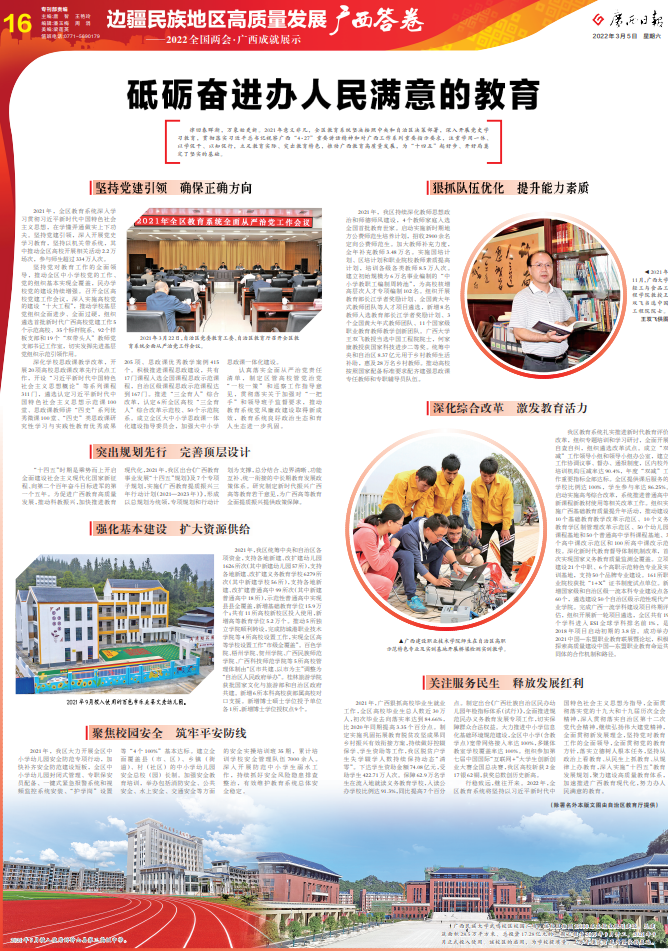 律回春暉漸,萬象始更新。2021年意義非凡,全區教育系統堅決按照中央和自治區決策部署,深入開展黨史學習教育,貫徹落實習近平總書記視察廣西“4·27”重要講話精神和對廣西工作系列重要指示要求,注重學用一體、以學促干、以知促行,立足教育實際、突出教育特色,推動廣西教育高質量發展,為“十四五”起好步、開好局奠定了堅實的基礎。
