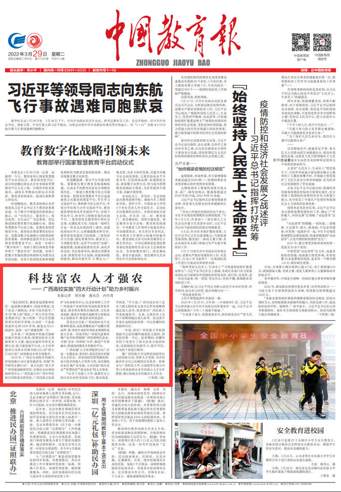 近年來,廣西圍繞鄉村振興戰略實施中的重大需求,統籌高校育人資源和育人力量,通過實施科學研究支撐行動、能力建設提升行動、人才培養提質行動和鄉村振興助力行動“四大行動計劃”,持續推動鄉村全面振興。