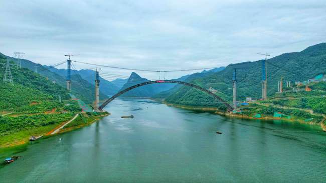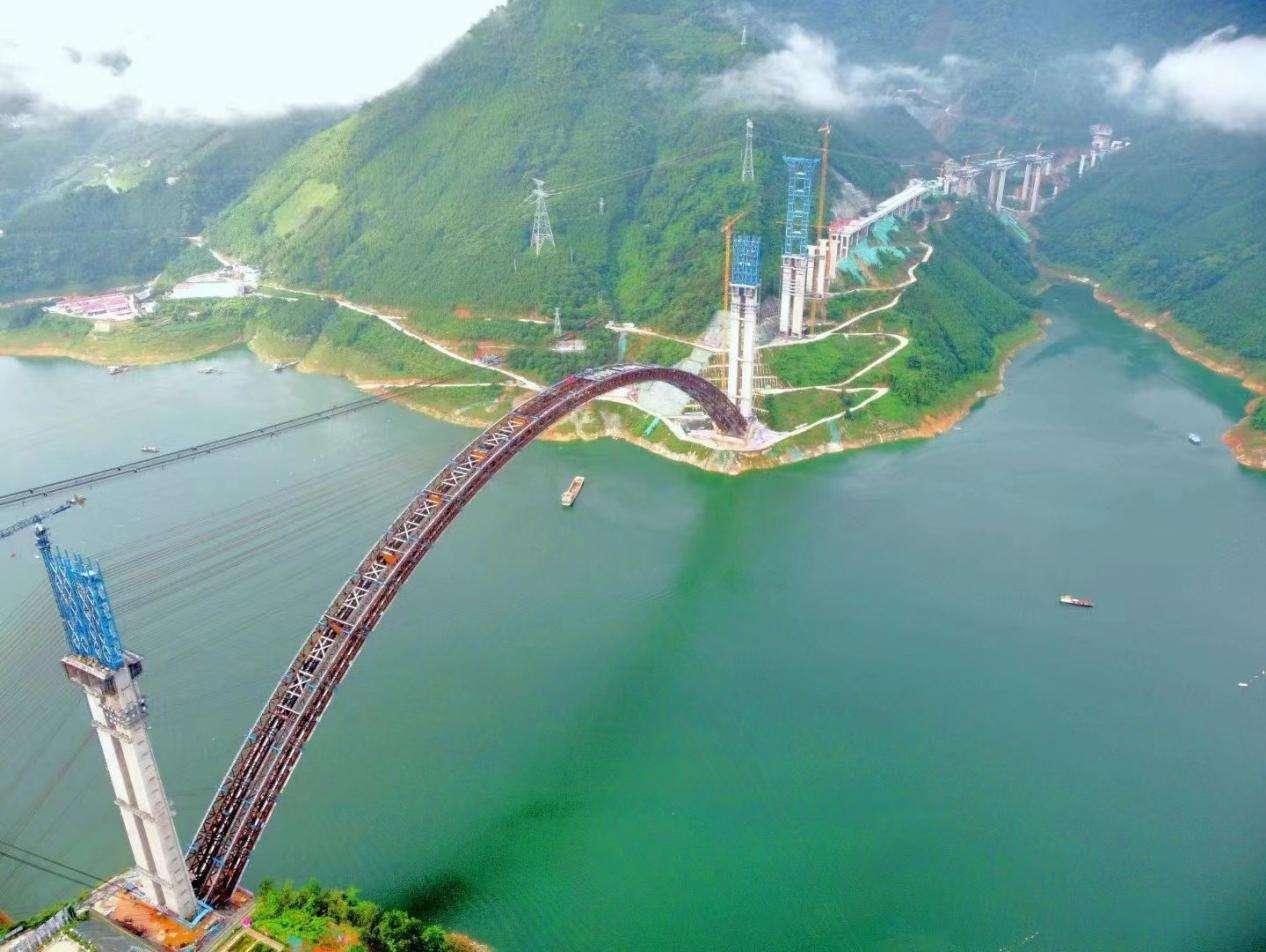 天峨龍灘特大橋位于廣西河池市天峨縣龍灘水庫,是南丹至天峨下老高速公路控制性工程、西部陸海新通道高速公路上的一座上承式勁性骨架混凝土拱橋。天峨縣是廣西最后三個沒有通高速的縣域之一,目前正在修建的南丹至天峨下老高速公路將改變這一局面。而天峨龍灘特大橋是這條高速公路上的一個重點控制性工程,大橋全長2488.55米。其中,主橋采用上承式勁性骨架混凝土拱橋方案,跨徑600米,建成后將成為世界最大跨徑拱橋,把混凝土拱橋跨徑的世界紀錄提高了155米。該橋跨度大,設計、施工難度極高,將成為拱橋建造史上的又一里程碑,同時對于國家戰略“一帶一路”南向東盟、川藏鐵路、西部陸海新通道沿線橋梁工程的建設具有引領性的示范作用。