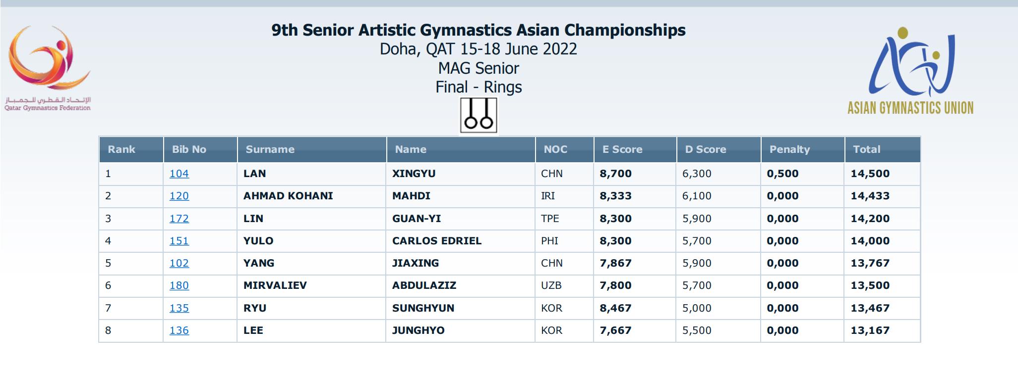 男子吊環決賽,中國選手蘭星宇(我校體育學院學生)以14.500分摘金,另一位中國選手楊家興得到13.767分,最終排名第五。