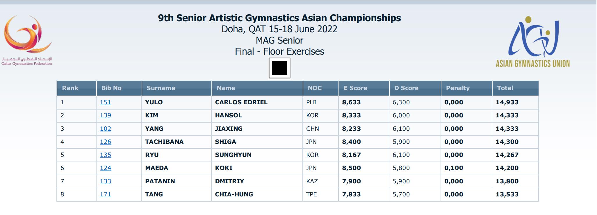 此外,楊家興在男子自由操決賽中得到與韓國選手金韓松相同的14.333分,因完成分稍低排在韓國選手之后,收獲一枚銅牌。尹德行在男子鞍馬決賽中得到14.600分,同樣收獲一枚銅牌。