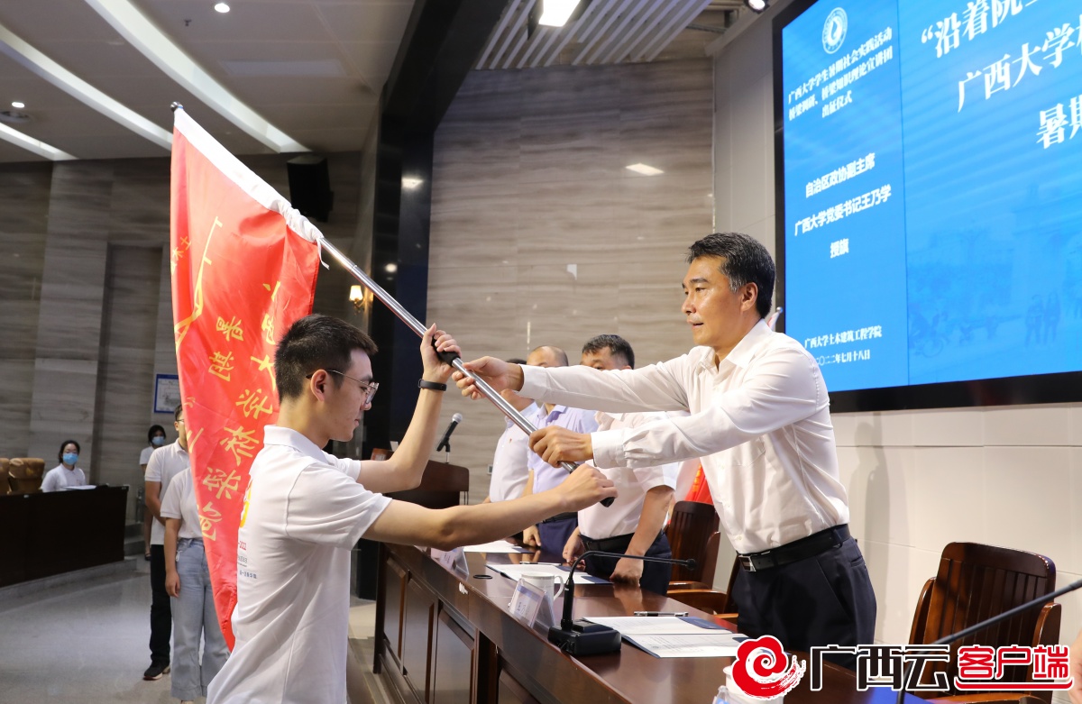 7月18日,“沿著院士足跡、扎根八桂大地、建設(shè)壯美廣西”廣西大學(xué)橋梁調(diào)研團(tuán)、橋梁知識理論宣講團(tuán)暑期“三下鄉(xiāng)”社會實踐活動出征儀式在土木建筑工程學(xué)院舉行。自治區(qū)政協(xié)副主席、廣西大學(xué)黨委書記王乃學(xué)出席出征儀式并為實踐隊授旗。