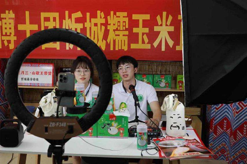 實踐隊員為忻城縣糯玉米直播帶貨。李永強攝