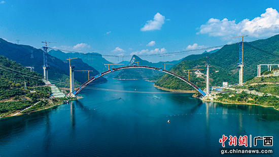 中新網廣西新聞11月10日電(劉娜利)11月8日,在廣西河池市天峨縣紅水河流域龍灘庫區,泵車傳送,吊車起重,貨船穿梭,人聲鼎沸,一片繁忙和喜慶圖景點亮連綿青山。隨著橋外包砼底板混凝土第六階段第一工作面澆筑段、第三工作面澆筑段的澆筑完成,由中國工程院院士、廣西大學土木建筑工程學院教授鄭皆連主持修建的跨徑600米的世界最大跨徑拱橋——天峨龍灘特大橋外包砼底板環順利合龍。