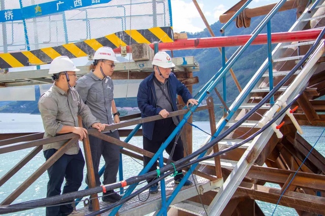 自今年3月開展天峨龍灘特大橋外包混凝土足尺模型試驗以來,鄭皆連院士圍繞外包混凝土施工多次主持召開項目專家研討會和現場會,就大橋外包混凝土施工相關技術難點、科技瓶頸等進行交流指導,并多次往返于南寧和大橋建設現場指導,81歲高齡的他還親自攀上橋拱勘察工程進度,了解建設質量,對每一個流程、每一個環節都細致詢問和檢查,以他高度的責任擔當和精深的建橋造詣,帶領團隊為打造這座新的世界第一跨徑拱橋頑強奮戰、不懈攻關。