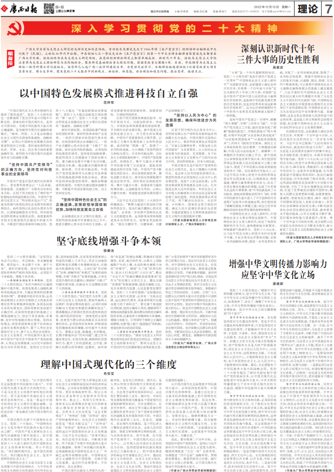 廣西大學(xué)具有馬克思主義研究的光輝歷史和優(yōu)良傳統(tǒng)。首任校長馬君武先生于1906年將《共產(chǎn)黨宣言》的綱領(lǐng)部分翻譯成中文刊載于《民報(bào)》,上世紀(jì)30年代中后期,中共創(chuàng)始人之一李達(dá)先生和《共產(chǎn)黨宣言》的第一個(gè)中文全譯本翻譯者陳望道先生都曾在廣西大學(xué)任教。該校始終傳承馬克思主義研究傳統(tǒng),在黨的創(chuàng)新理論研究上取得卓越成效。新時(shí)代十年來,該校馬克思主義學(xué)院注重將馬克思主義理論研究與實(shí)際相結(jié)合,聚焦研究基礎(chǔ)理論重大現(xiàn)實(shí)問題,獲國家級重大課題5項(xiàng)。目前,學(xué)校擁有馬克思主義理論一級學(xué)科博士學(xué)位授權(quán)點(diǎn),該學(xué)科已入選廣西一流學(xué)科建設(shè)名單。為更好交流學(xué)習(xí),本期理論版邀請?jiān)撔?位國家級重大項(xiàng)目首席專家、博士生導(dǎo)師,聚焦黨的二十大報(bào)告中的新觀點(diǎn)、新論斷、新思想,結(jié)合理論和現(xiàn)實(shí)問題,提出思考。敬請關(guān)注。