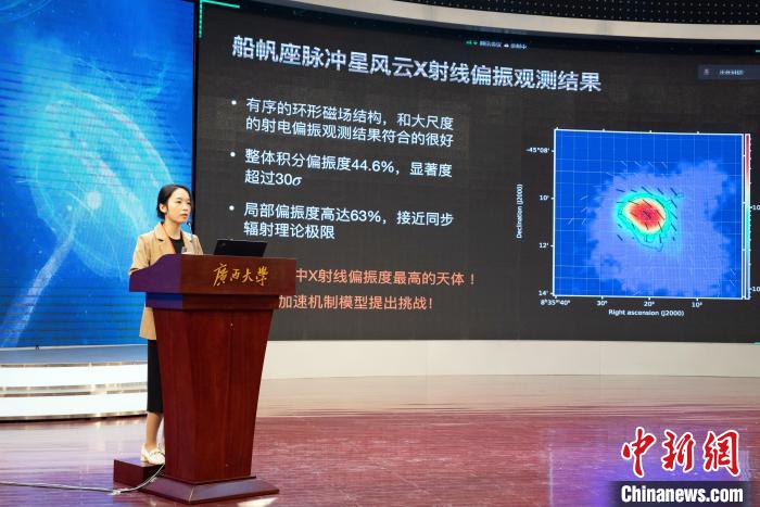 中新網南寧12月22日電 (黃艷梅 羅穎佳)廣西大學22日召開成果發布會,介紹該校天文與空間科學技術團隊與國際團隊合作取得的重大科學發現。其研究論文當日以“船帆座脈沖星風云X射線偏振趨近同步輻射理論極限”為題在國際頂級學術雜志《自然》(Nature)發表。廣西大學為研究論文的第一作者單位,青年教師謝斐博士為第一作者和唯一通訊作者主導了該項研究。