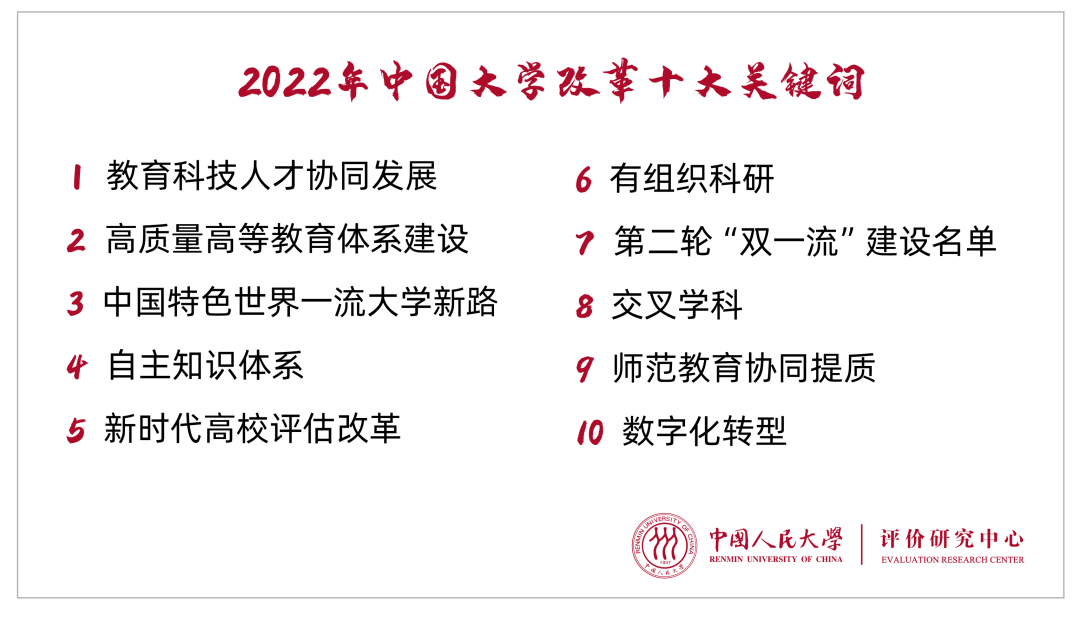 2022年12月30日,在中國人民大學舉辦的“2022年中國大學改革創新指數發布會暨研討會”上,中國人民大學評價研究中心發布了“2022年中國大學改革十大關鍵詞”和“2022年中國大學改革創新指數”。
