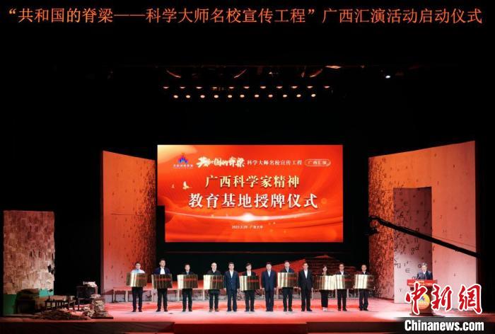 “共和國的脊梁——科學大師名校宣傳工程”廣西匯演活動由廣西壯族自治區科協、自治區教育廳、共青團廣西區委、廣西科學院共同承辦,廣西壯族自治區副主席李常官,自治區政協副主席、廣西大學黨委書記王乃學等出席活動并致辭,廣西壯族自治區科協黨組書記、副主席納翔主持啟動儀式。廣西大學、廣西科技館(廣西青少年科技中心)等9個榮獲廣西科學家精神教育基地的單位獲頒牌匾。