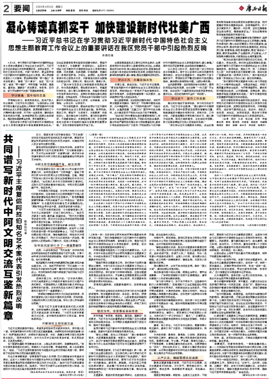 4月3日,學(xué)習(xí)貫徹習(xí)近平新時(shí)代中國(guó)特色社會(huì)主義思想主題教育工作會(huì)議在北京召開(kāi)。習(xí)近平總書(shū)記出席會(huì)議并發(fā)表重要講話,在我區(qū)黨員、干部中引發(fā)熱烈反響。大家一致表示,要全面貫徹習(xí)近平新時(shí)代中國(guó)特色社會(huì)主義思想,深入貫徹落實(shí)黨的二十大精神,更加深刻領(lǐng)悟“兩個(gè)確立”的決定性意義,增強(qiáng)“四個(gè)意識(shí)”、堅(jiān)定“四個(gè)自信”、做到“兩個(gè)維護(hù)”,牢牢把握“學(xué)思想、強(qiáng)黨性、重實(shí)踐、建新功”的總要求,學(xué)思想、見(jiàn)行動(dòng),奮力開(kāi)創(chuàng)新時(shí)代壯美廣西建設(shè)新局面。