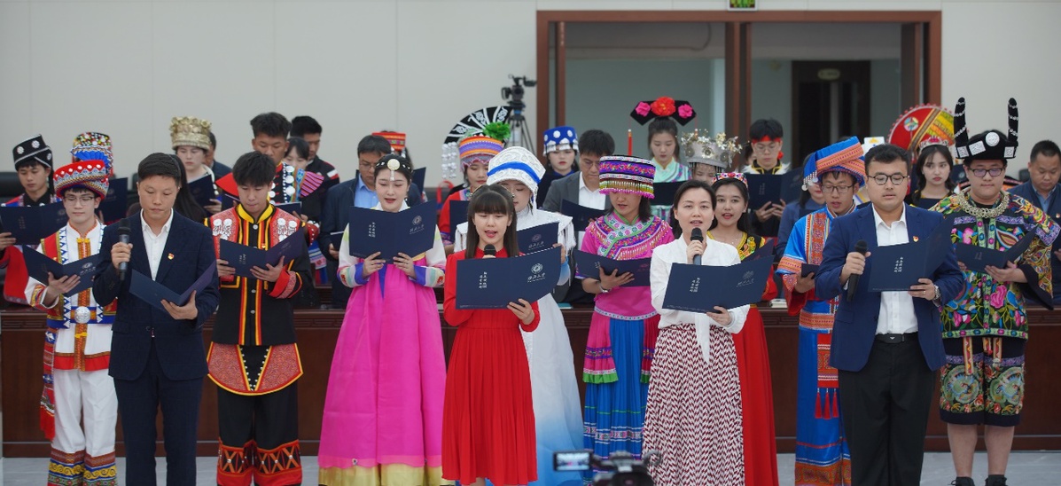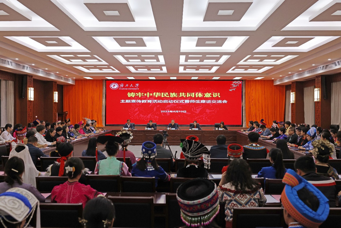 4月10日,廣西大學(xué)在君武館玉林廳召開2023年鑄牢中華民族共同體意識主題宣傳教育活動啟動儀式暨師生座談交流會,各民族師生代表身著民族盛裝,歡聚一堂,共唱民族團(tuán)結(jié)之歌、共享民族進(jìn)步之果、共話民族工作之策。