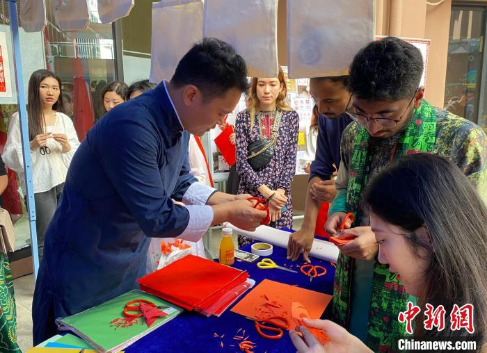圖為留學生在學習剪紙?!V西大學國際學院供圖
