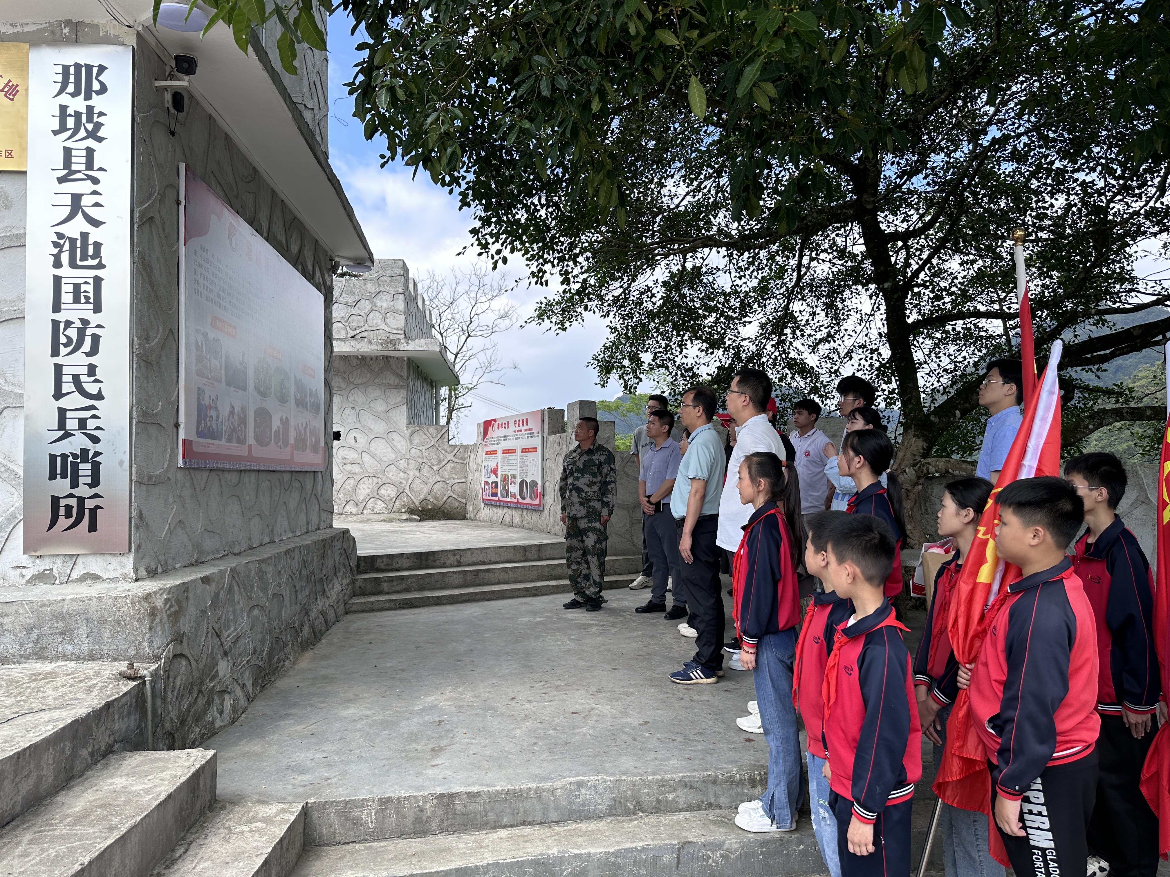 在那坡縣天池國防民兵哨所,副哨長班正華為參加活動的同學們介紹天池哨所哨長、“全國最美奮斗者”、全國“優秀共產黨員”凌尚前同志四十余年如一日扎根哨所、巡邊護邊的先進事跡。為在場的廣西大學研究生支教團的同學們,以及那坡縣平孟鎮九年一貫制學校的團員、少先隊員們上了一堂生動的微黨課、微團課、微隊課。
