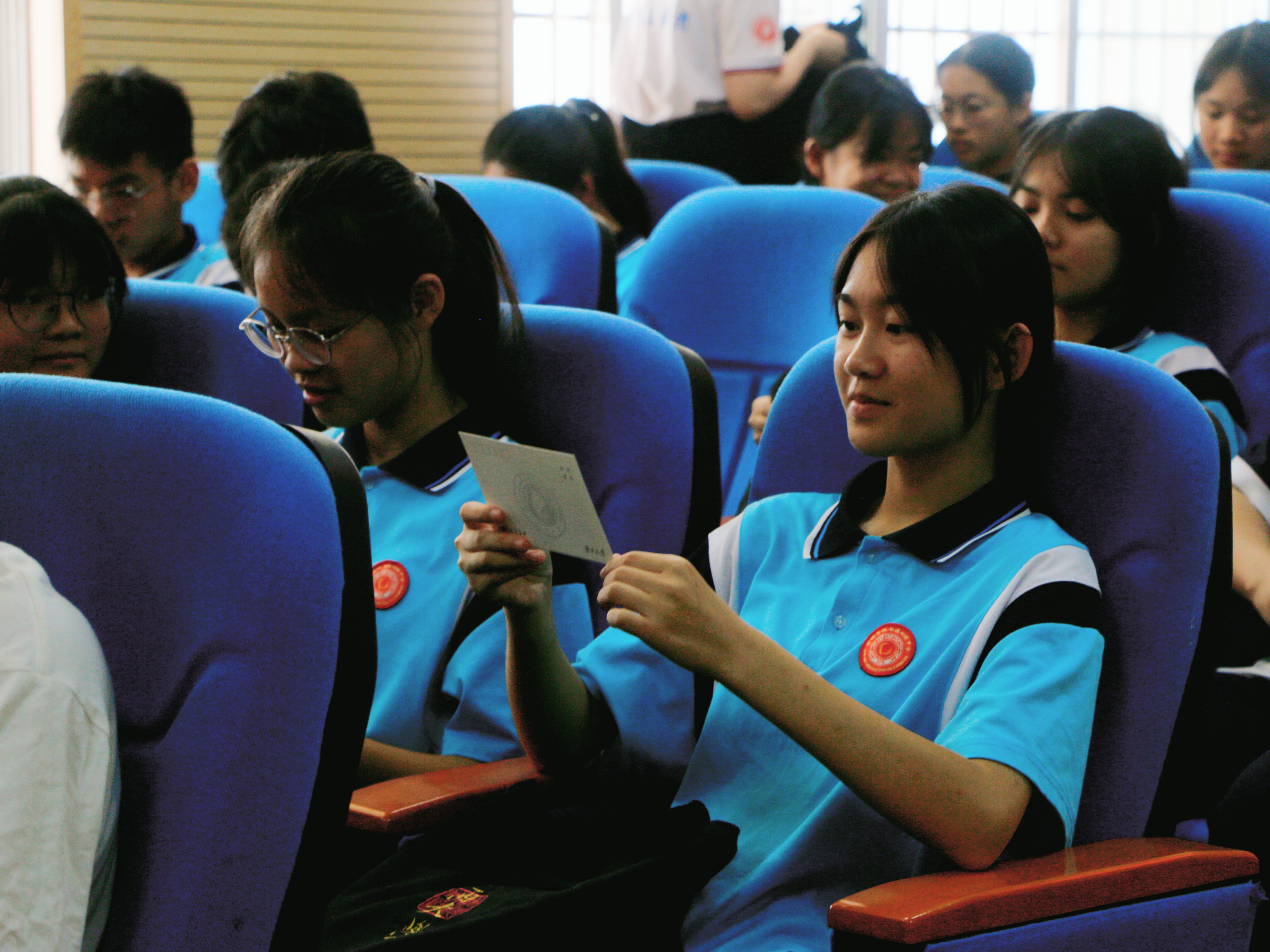 ? 初三學生正在閱讀來自廣西大學同學的手寫祝福 廣西大學供圖