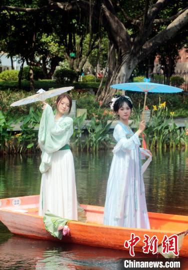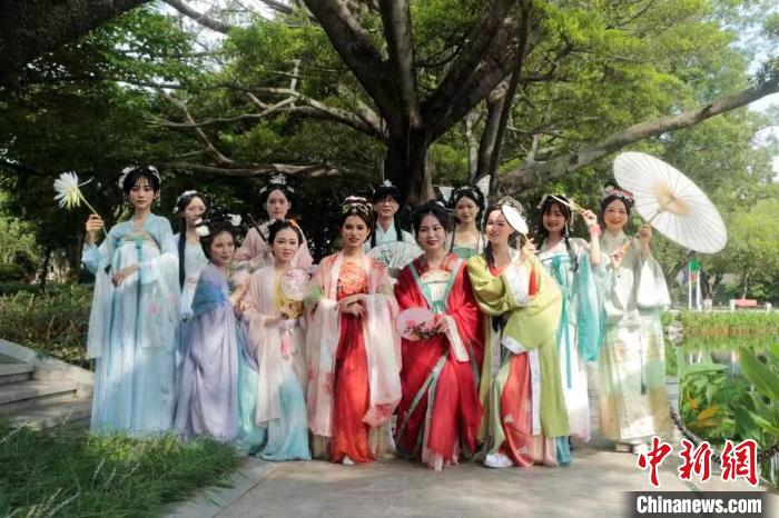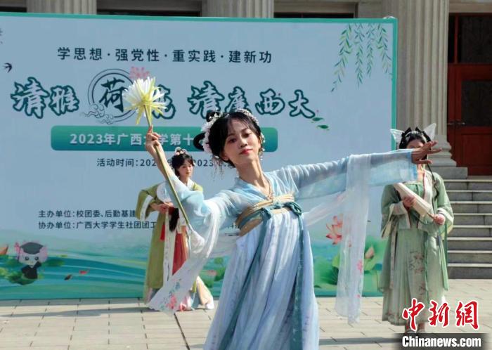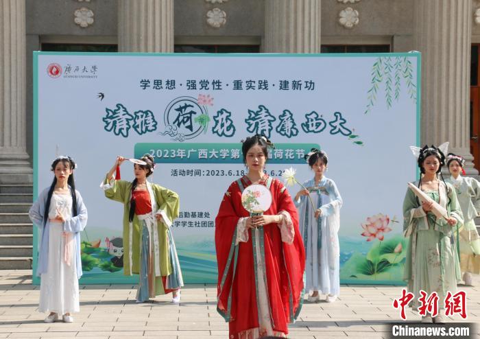 6月18日,廣西大學第十六屆荷花節開幕,學子身著漢服參加荷花主題走秀等活動。