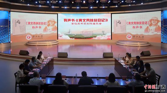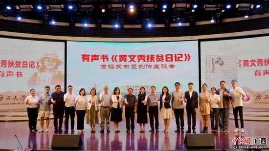 有聲書上線當(dāng)天,正值“七一勛章”獲得者、“時(shí)代楷模”黃文秀犧牲四周年,在這個(gè)特殊的日子,在廣西大學(xué)新聞與傳播學(xué)院融媒體中心舉行了有聲書《黃文秀扶貧日記》首播發(fā)布暨創(chuàng)作座談會(huì)。有聲書的制作團(tuán)隊(duì)和參與播講的師生代表參加活動(dòng)。