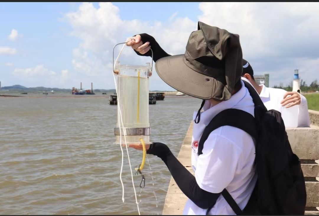 廣西大學海洋學院學生在第15標段入??谝约懊┪埠9珗@進行實地取水,并進行海水檢測,以了解海水水質情況。 周奕彤/攝