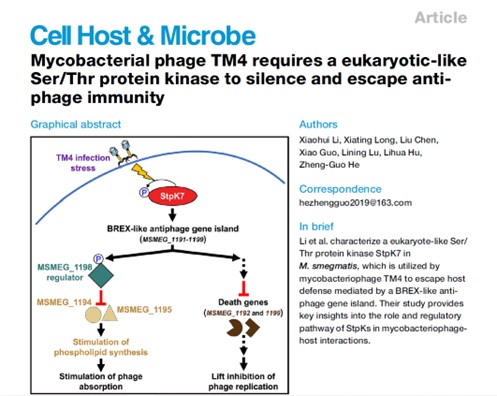 已有的研究表明,絲氨酸/蘇氨酸激酶(StpK)廣泛存在于真核生物和細菌中,通常發(fā)揮抗病毒的作用。何正國團隊發(fā)現(xiàn)分枝桿菌噬菌體TM4能夠利用細菌中的StpK逃逸宿主的防御,因此定義了第一個噬菌體宿主因子蛋白激酶,同時在分枝桿菌中鑒定了第一個該類激酶調(diào)控的抗噬菌體防御基因島。該研究表明,在噬菌體感染過程中,TM4顯著誘導(dǎo)宿主分枝桿菌細胞內(nèi)StpK7的表達和磷酸化?;罨腟tpK7一方面通過磷酸化一個類BREX防御島中的轉(zhuǎn)錄因子抑制其下游靶基因的表達,最終促進了磷脂合成和對噬菌體的吸附;另一方面,StpK7抑制了細菌細胞死亡基因的表達,從而抑制了宿主細菌的流產(chǎn)感染。這兩方面的共同作用最終增強噬菌體的感染和復(fù)制能力。