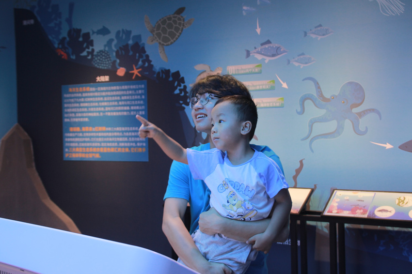 在“探秘廣西大學海洋科教館”環節,參觀者們在“藍色夢想·科普先行”海洋保護與知識科普志愿服務隊成員的帶領下,深入學習了海洋科教館蔚藍之境、海洋之魅、研海之行、探海之道、筑夢之基等五個主題的知識。通過館內互動式、沉浸式等AR高科技設備,參觀者更直觀地感受到“海底種珊瑚”和“深海勇士號”深潛的奧妙。珊瑚養殖室讓參觀者們“零距離”接觸“海洋中的熱帶雨林——珊瑚礁”,絢麗多姿的珊瑚以及活潑可愛的海魚深深吸引了參觀者們的目光。在“我問你答海洋知識競賽”,參與者積極參與答題。