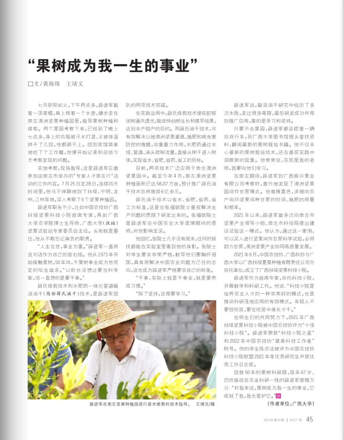 七月驕陽如火,下午兩點(diǎn)多,薛進(jìn)軍戴著一頂草帽,肩上挎著一個(gè)水壺,健步走在崇左澳洲堅(jiān)果種植園里,指導(dǎo)果樹種植和修剪。兩個(gè)果園考察下來,已經(jīng)到了晚上七點(diǎn)多,身上的衣服被汗水打濕、又被體溫烘干了幾回,他都顧不上。回到賓館簡(jiǎn)單地吃了個(gè)工作餐,他便開始記錄和總結(jié)今天考察發(fā)現(xiàn)的問題。