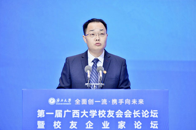 廣西大學黨委副書記馬獻力出席了開幕式并致辭。馬副書記表示,今年是廣西大學建校九十五周年,也是學校“雙一流”建設的關鍵之年。學校舉辦本次校友會會長論壇暨校友企業家論壇,就是為了讓廣大校友和校友企業家與母校結成奮斗共同體、利益共同體、命運共同體,深化合作,促進校友和校友企業家事業發展與新時代壯美廣西建設同頻共振,共繪壯美新藍圖,期待著與校友們一起交流感情、分享經驗、暢談感悟、共謀發展。