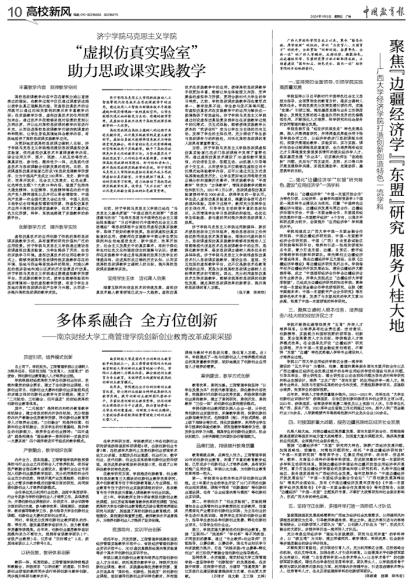 學院以“邊疆經濟學”“中國—東盟開放合作”為特色引領,以經濟學、金融學和國際貿易學3個國家一流本科專業建設點為依托,打磨“中國特色邊疆經濟與理論、邊疆經濟發展與周邊合作、邊疆經濟治理與安全、中國—東盟金融合作、東盟國別經濟發展和中國—東盟數字經濟”6個方向,以高水平科研成果為抓手,全面提升“應用經濟學”學科建設水平。