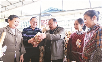 2月1日,廣西大學新農村發展研究院食用菌服務團團長覃培升(中)為當地種植戶講解菌棒培育注意事項。本報記者 馮子琪 攝