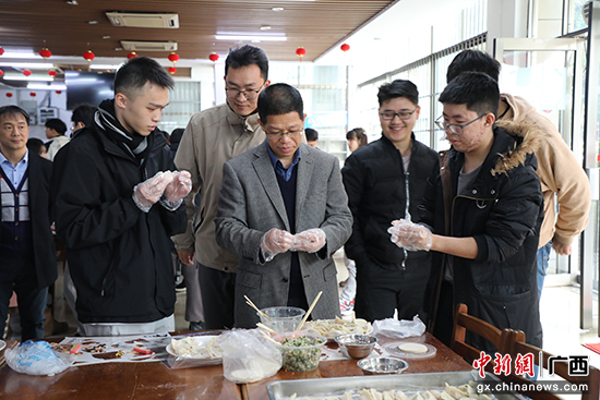 2月9日,農歷除夕,廣西大學黨委常委、副校長寧旭初與留校學生同吃年夜飯,共賀龍年新春佳節。