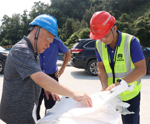 鄭皆連院士在天峨龍灘特大橋施工現(xiàn)場查看智能調(diào)高支座。 (廣西路橋工程集團(tuán)有限公司供圖)