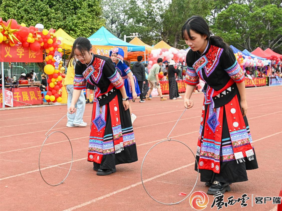 射箭、高腳馬、拋繡球、打陀螺、民族服飾展、民族文化展……運動會現場“桂味”十足。師生們熱情體驗民族傳統競技項目,現場洋溢著青春、喜慶的氛圍,一片歡聲笑語、其樂融融;在民族文化展示和體驗區,民族特色展品精巧奪目,民族服裝走秀異彩紛呈,師生們深刻感受到民族文化的魅力,玩出新花樣。