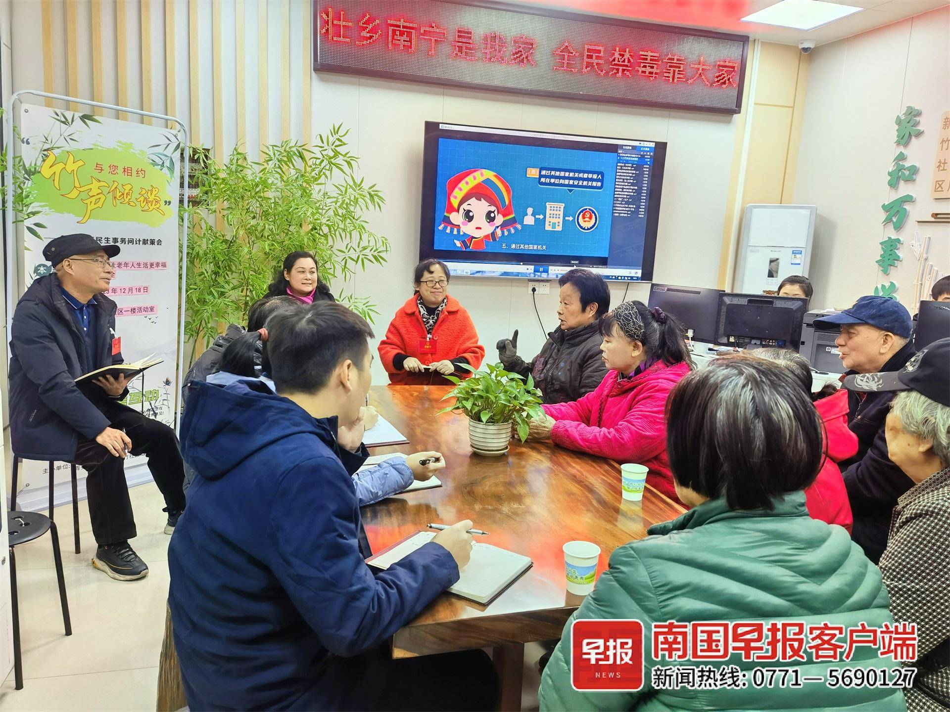 “今天的主題是如何提高老年人的幸福生活,我們想聽一聽大家有什么意見和建議。”南寧市人大代表,南寧市青秀區(qū)新竹街道新竹社區(qū)黨委書記、居委會(huì)主任覃毓寧率先開場(chǎng)。退休老人黃愛群第一個(gè)發(fā)言:“入冬了,老年人不僅要注意防寒、防二氧化碳中毒,還要防詐騙。另外,大家多留意身邊的老年朋友,有誰很久沒露面了,這有可能是健康信號(hào)。”