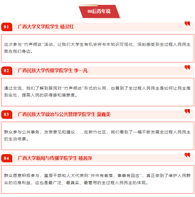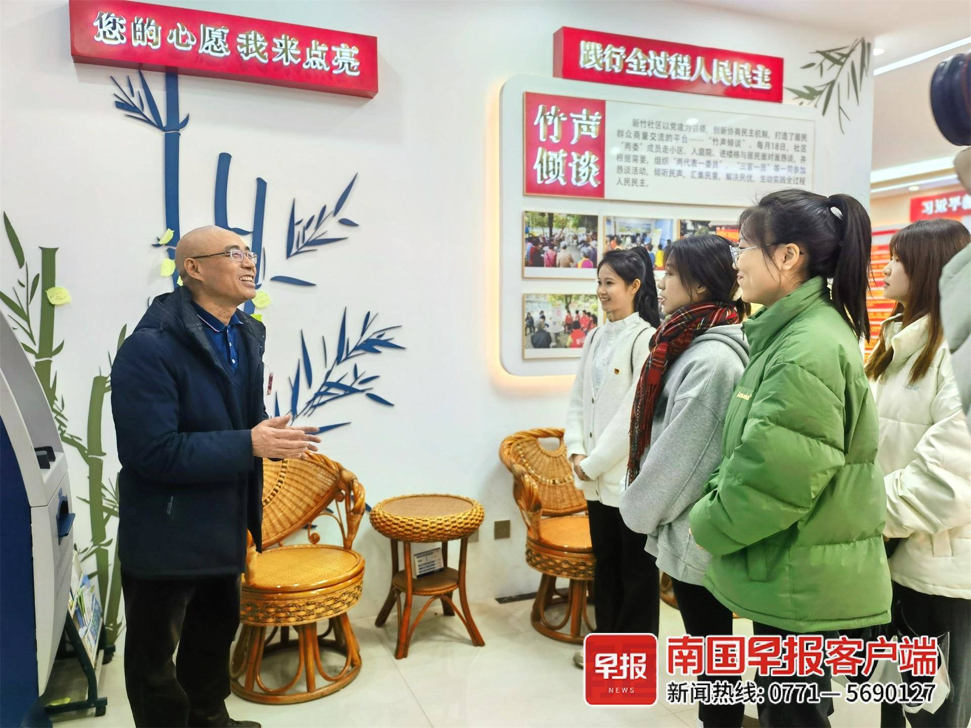 當(dāng)天上午,來自廣西大學(xué)、廣西民族大學(xué)的大學(xué)生們也與記者一起走進(jìn)新竹社區(qū),在“竹聲傾談”民情懇談會(huì)里,沉浸式感受基層民主的溫度。