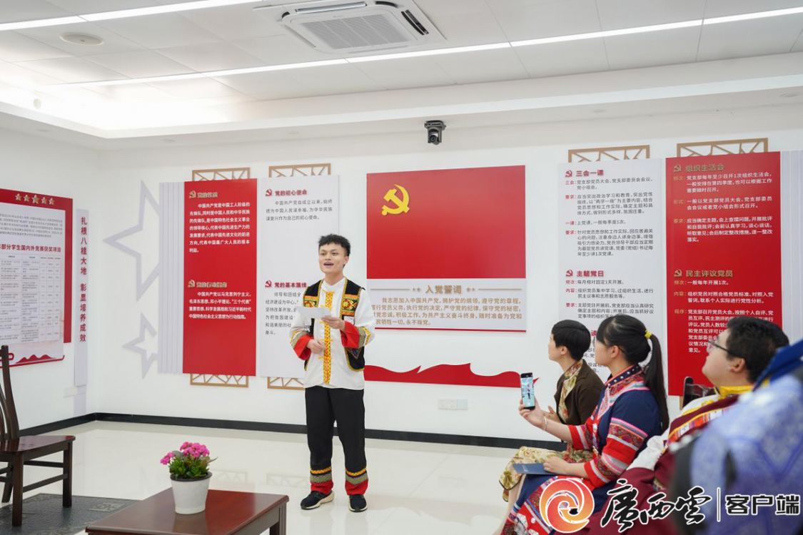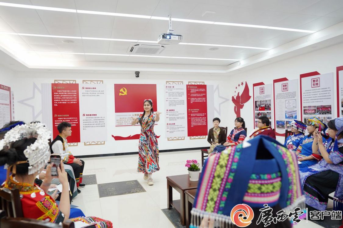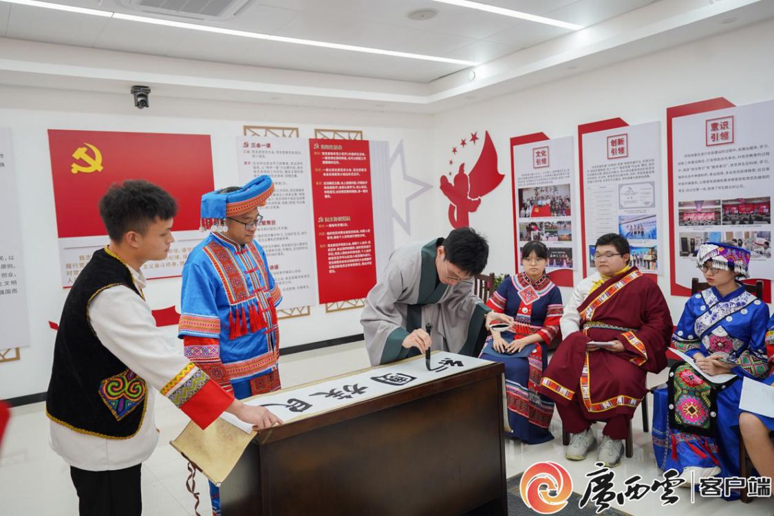 身著壯族傳統服飾的學院黨委書記羅誠與漢、壯、苗、瑤、仫佬、維吾爾、納西、傣、滿等14個民族的學生代表歡聚一堂,唱支山歌給黨聽、同心共話民族情。