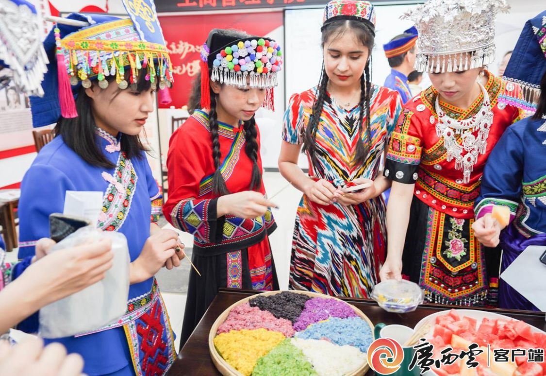 師生們品嘗壯族傳統美食五色糯米飯。
