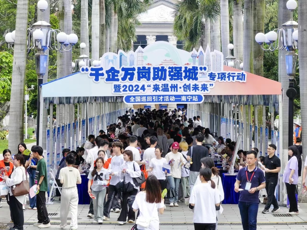 4月18日至19日,“千企萬崗助強城”專項行動暨2024“來溫州·創未來”全國巡回引才活動—南寧站專場招聘會在廣西大學舉辦。130多家來自溫州的用人單位提供2500多個崗位。活動現場,達成到溫州工作意向964人,有的求職者現場就獲錄用。