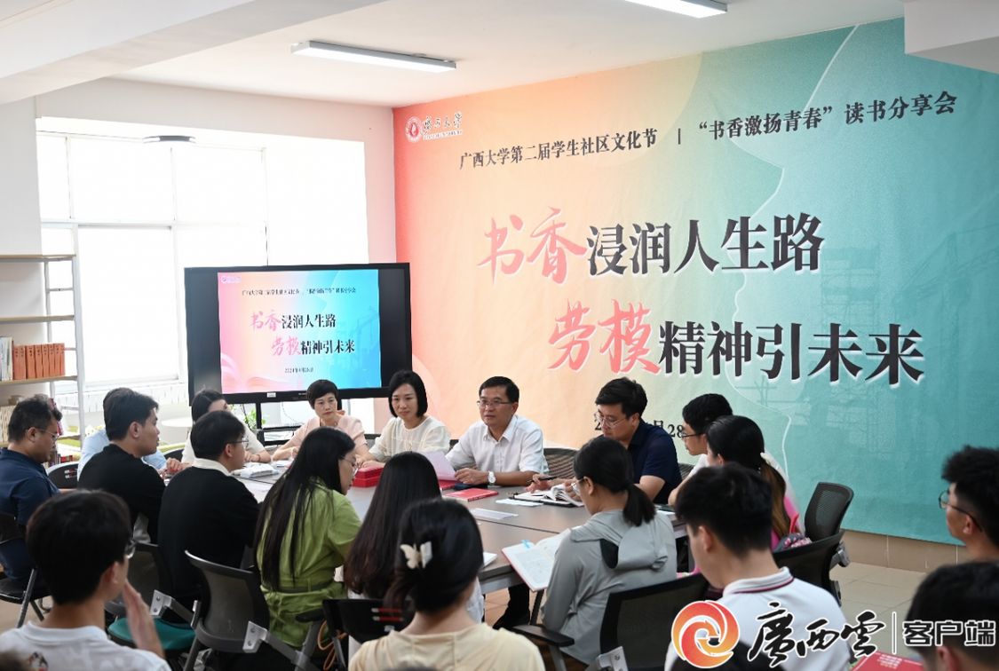 全國五一勞動獎章獲得者,廣西大學輕工與食品工程學院院長覃程榮教授與輕工與食品工程學院、工商管理學院、電氣工程學院、機械工程學院、化學與化工學院、新聞與傳播學院、經濟學院、林學院40余名師生齊聚一堂,悟書卷之道,承勞模之志。