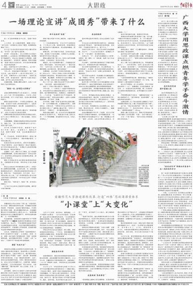 如何不斷提升思政課的針對性和吸引力,推動學(xué)生更好地了解國情民情,堅定理想信念,廣西大學(xué)從延伸思政課的時間空間破題,在思政教育中充分挖掘社會大課堂豐富的育人資源,讓學(xué)生在走近紅色人物、重溫紅色歷史、觸摸發(fā)展藍(lán)圖的過程中,激發(fā)為中國式現(xiàn)代化奮斗的青春激情。