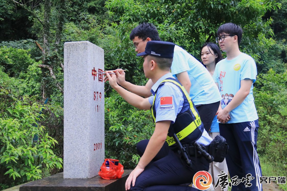 在蒙蒙細雨中,實踐團師生整齊列隊,跟隨民警開展巡邊體驗,并為879號界碑描紅,聆聽守邊固邊興邊故事。