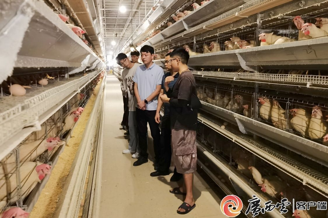 在廣西三江騰竣農(nóng)業(yè)有限公司的沙宜蛋雞養(yǎng)殖示范基地,標(biāo)準(zhǔn)化雞籠排列整齊,其喂料、揀蛋、集糞、光照、控溫等程序全部自動(dòng)運(yùn)行。實(shí)踐團(tuán)師生通過(guò)實(shí)地參觀,全面了解企業(yè)的發(fā)展歷程、業(yè)務(wù)板塊、生態(tài)保護(hù)、粵桂協(xié)作等情況,并與技術(shù)人員詳細(xì)探討蛋雞養(yǎng)殖的關(guān)鍵要素、創(chuàng)新工藝和實(shí)踐經(jīng)驗(yàn)。