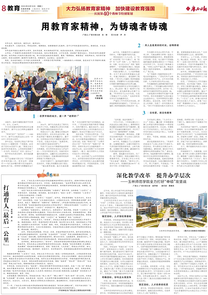為慶祝第40個教師節,弘揚教育家精神,加大優秀教師典型宣傳,講好廣西教育故事,9月6日,自治區教育廳在南寧舉行“弘揚教育家精神,講述育人故事”活動。其間,來自廣西大學等5所學校的優秀教師代表,講述了他們堅守教育初心,深耕教育一線,傳承師道精神的故事。