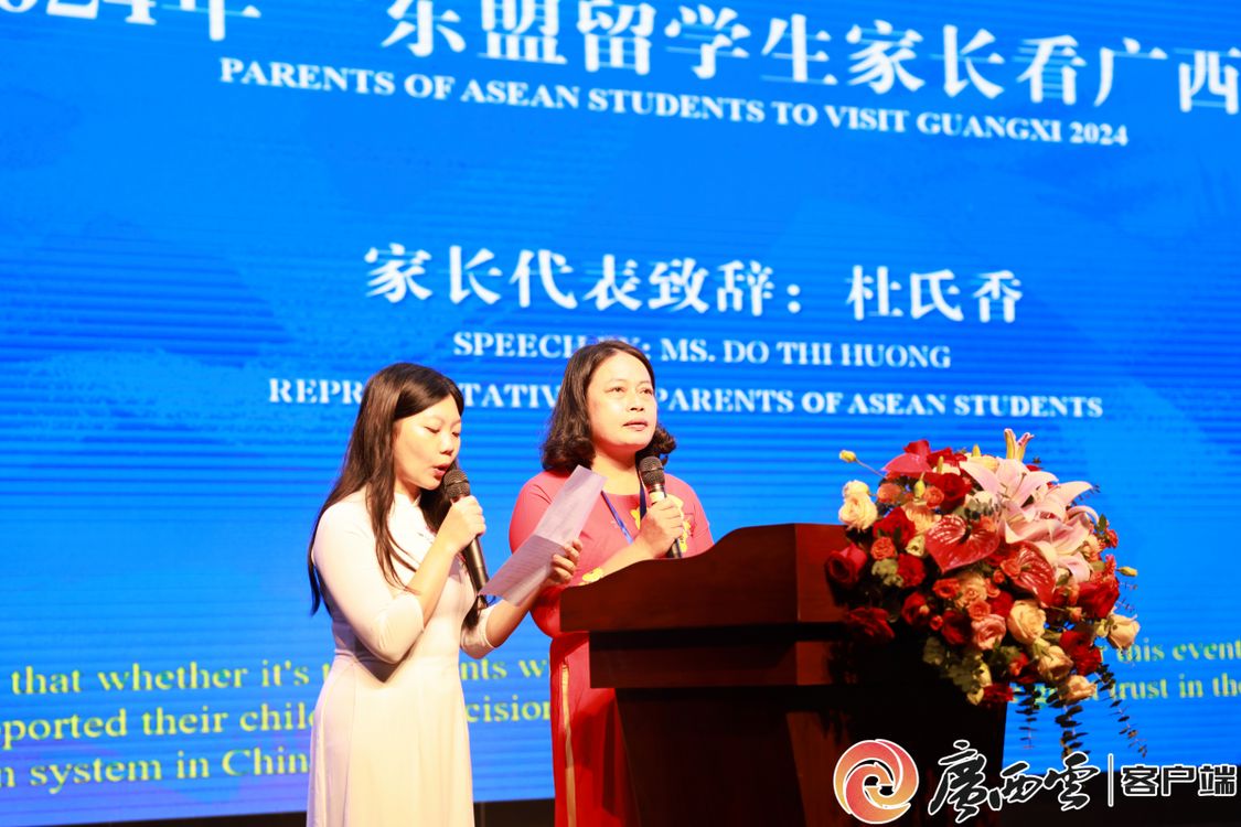 留學生家長代表杜氏香女士在致辭中,分享了女兒本科期間在中國學習、生活的點滴經歷,表達了對廣西教育環境的高度認可和對未來中國與東盟國家教育合作的期待與信心。