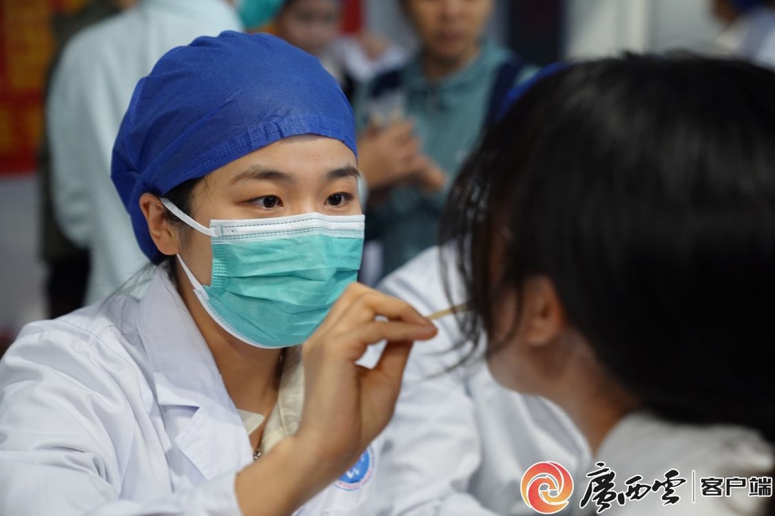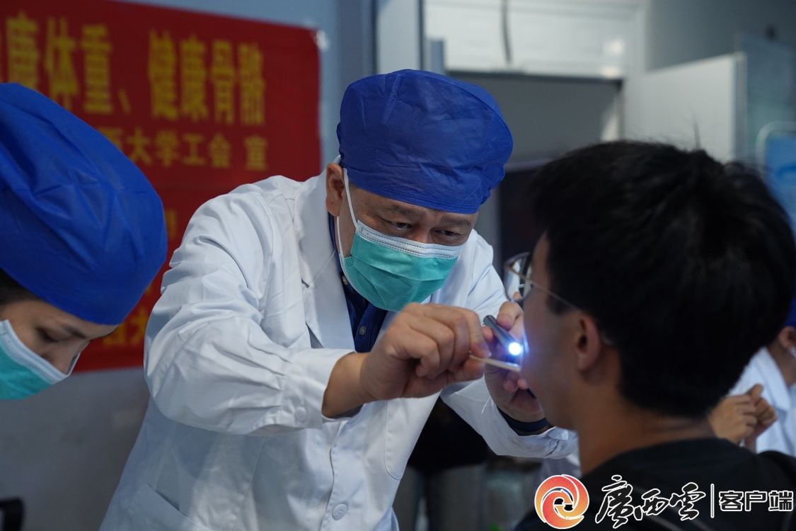 廣西醫(yī)科大學(xué)附屬口腔醫(yī)院院長(zhǎng)廖紅兵給廣西大學(xué)師生進(jìn)行口腔檢查。