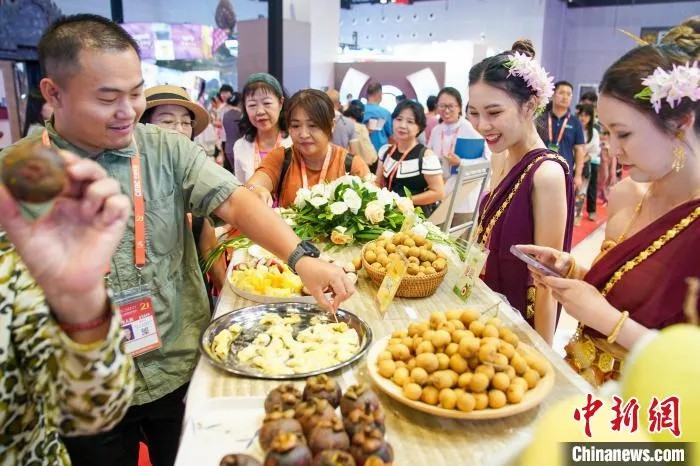 9月26日,第21屆中國—東盟博覽會上參觀者在泰國北柳府展位試吃泰國水果。陳冠言 攝