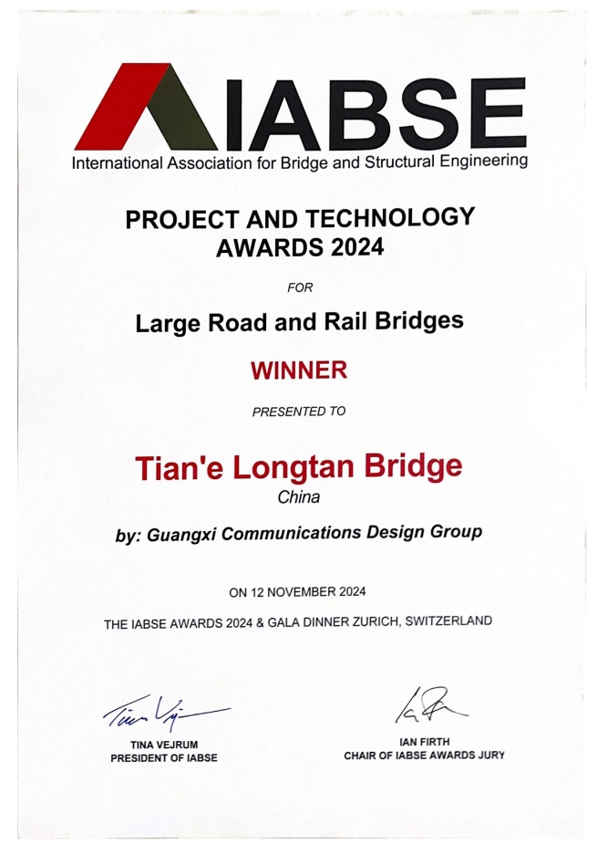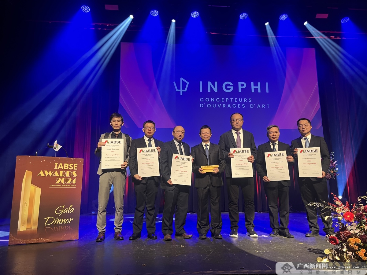 11月12日(當地時間),2024年國際橋梁與結構工程協會(簡稱IABSE)頒獎典禮在瑞士蘇黎世Volkshaus隆重舉行。全球38個工程入圍,我國有13個工程上榜,其中,由廣西交通投資集團投資、廣西路橋工程集團承建的天峨龍灘特大橋榮獲“大型公路與鐵路橋最高獎”。