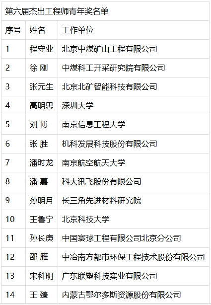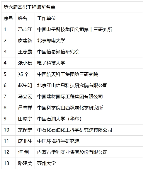 獎勵委員會最后審定通過了第六屆杰出工程師獎獲獎人員名單。具體如下: