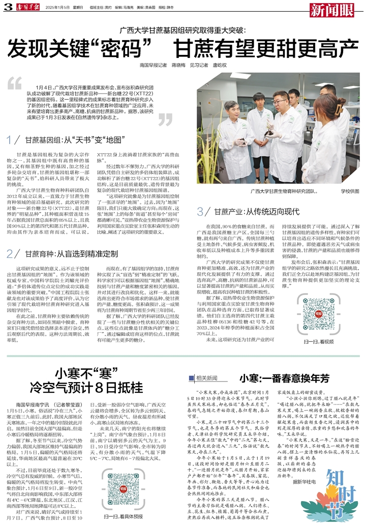 1月4日,廣西大學召開重要成果發布會,宣布張積森研究團隊成功破解了現代栽培甘蔗新品種——新臺糖22號(XTT22)的基因組密碼。這一里程碑式的成果標志著甘蔗育種研究步入了新的時代,隨著基因組學技術在甘蔗育種領域的廣泛應用,未來有望培育出更多高產、高糖、抗病的甘蔗新品種。據悉,該研究成果已于1月3日發表在《自然遺傳學》雜志上。