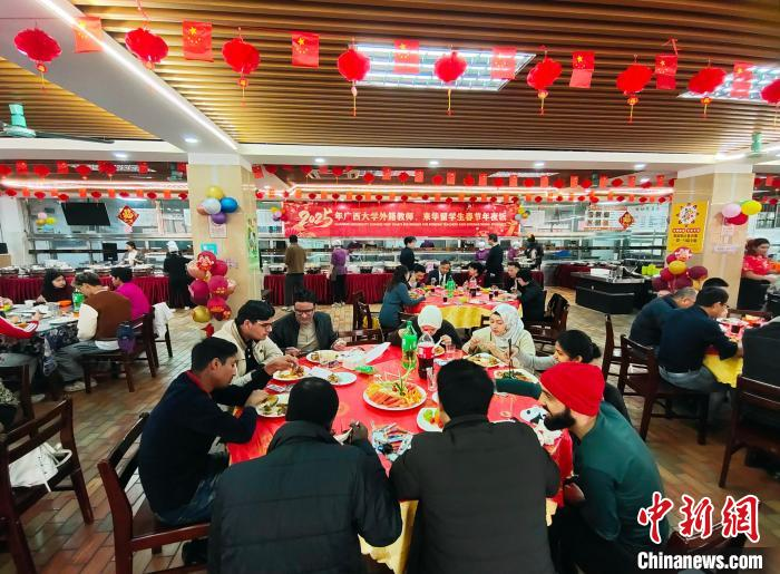 1月23日,正值中國南方小年,廣西大學舉辦外籍教師、來華留學生春節年夜飯活動,近300名中外師生共同參與書寫福字和春聯、畫臉譜、制作漆扇、投壺、套圈等春節游園活動,體驗中國傳統文化的魅力。活動現場熱鬧非凡,歡聲笑語不斷。
