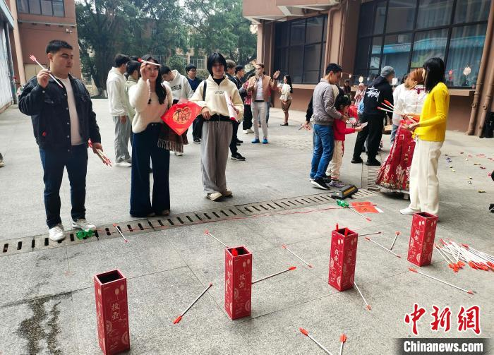 圖為留學生在參與趣味投壺游戲。中新網記者 黃艷梅 攝