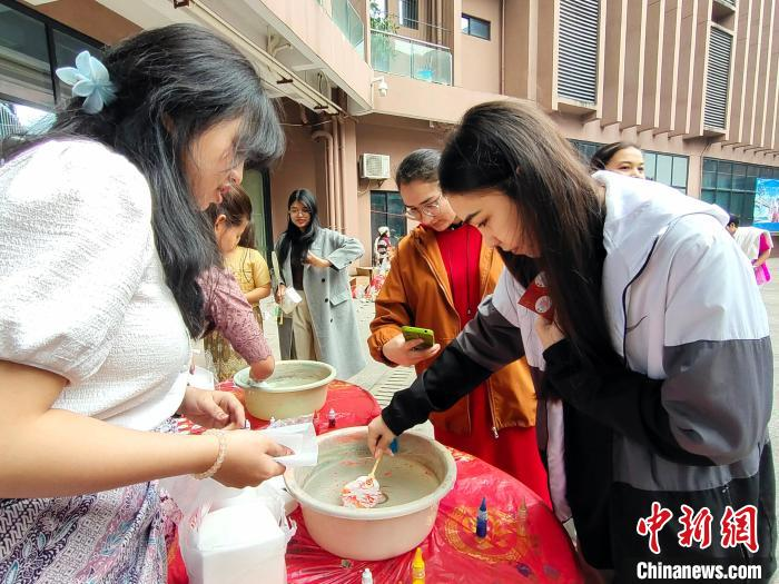 圖為留學生在制作漆扇。中新網記者 黃艷梅 攝